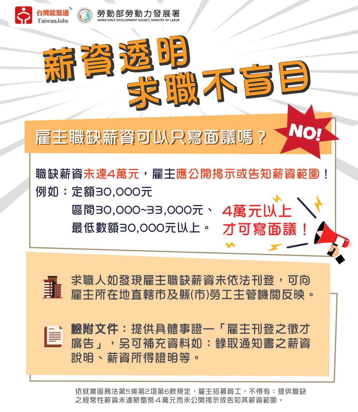 依就業服務法第5條第2項第6款規定,雇主招募員工,不得有:提供職缺之經常性薪資未達新臺幣4萬元而未公開揭示或告知其薪資範圍。